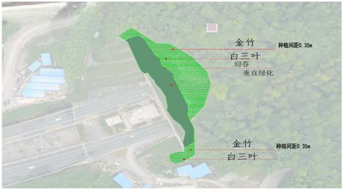 2、邊坡底部及頂部較平緩處選擇景觀效果較好的植物(金竹、白三葉)合理搭配,營造與自然恢復的野生植被相融合的植物群落。